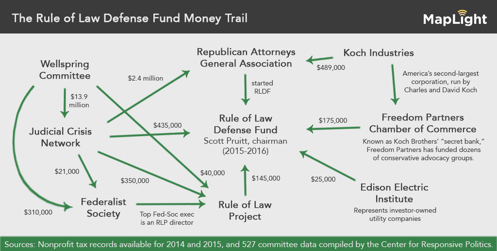 Scott Pruitt, the head of the Environmental Protection Agency, was previously the chairman of the Rule of Law Defense Fund (RLDF), an organization created by Republican attorneys general in 2014. The shadowy organization is at the center of a web of dark money nonprofits that have worked to advance conservative interests, and has helped organize state challenges to environmental regulations that could hurt polluters financially.
